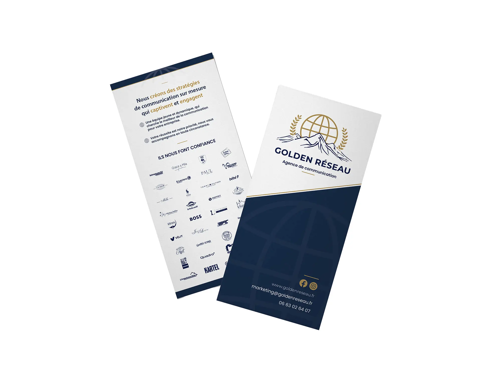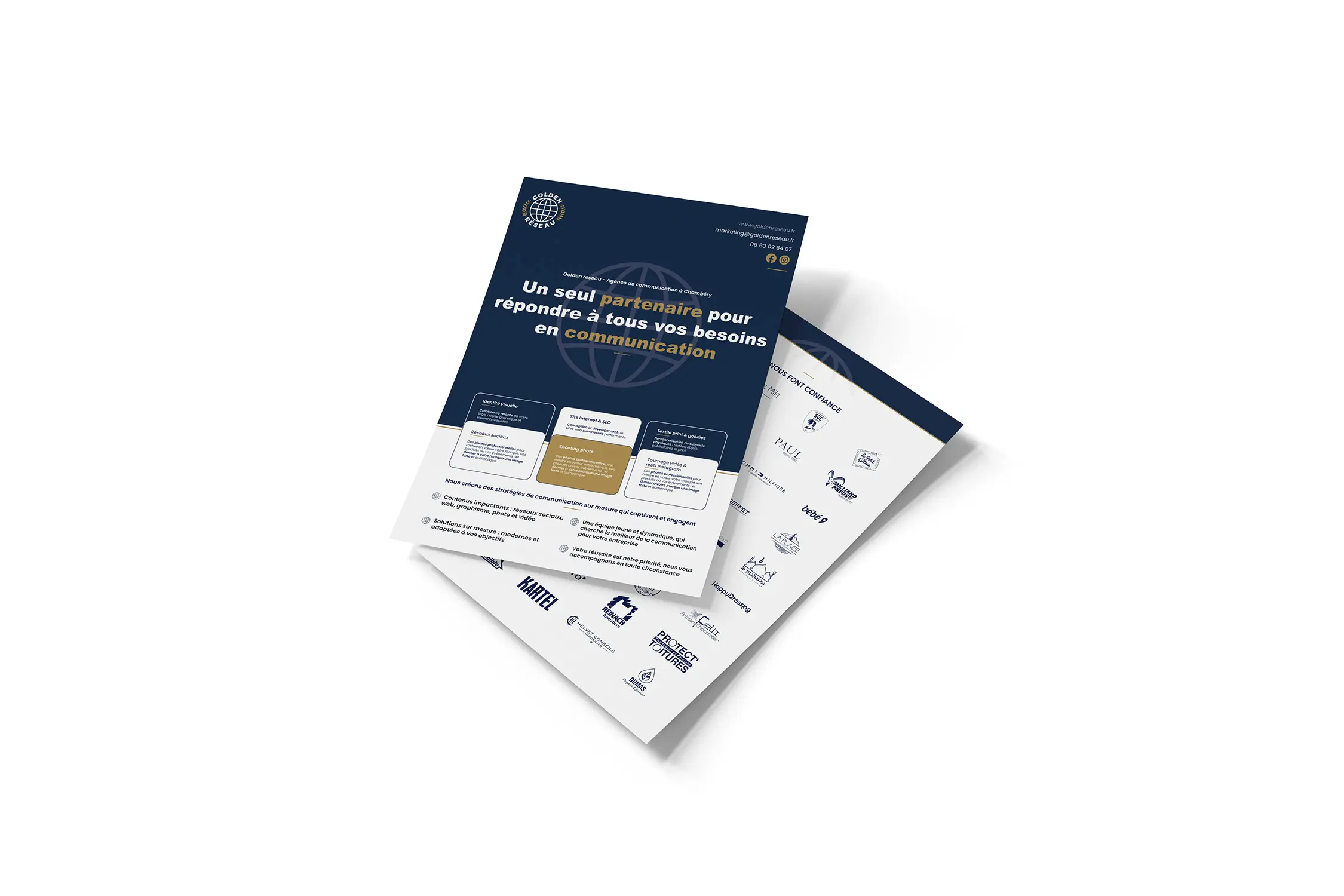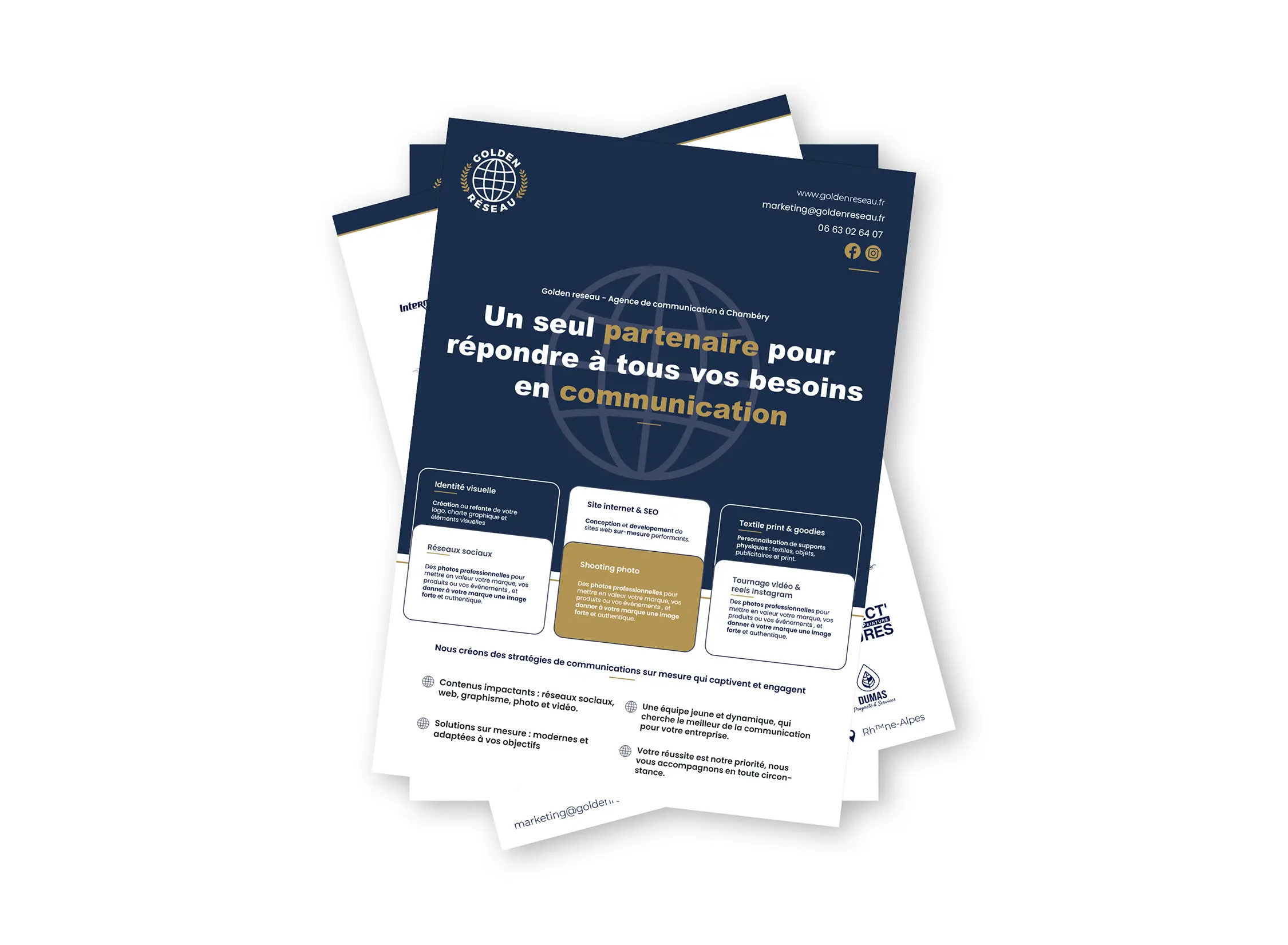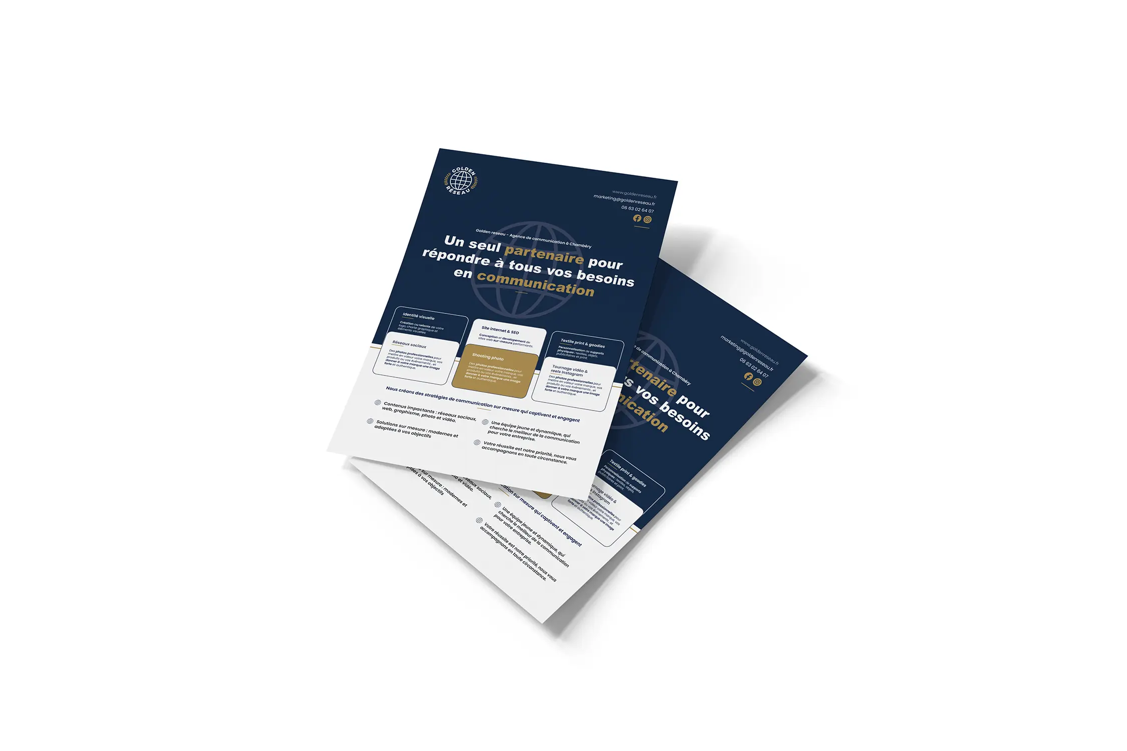 Chez Golden Réseau, agence de communication à Chambéry, nous vous accompagnons dans la création et l’impression de flyers professionnels, pensés pour capter l’attention et valoriser votre image.